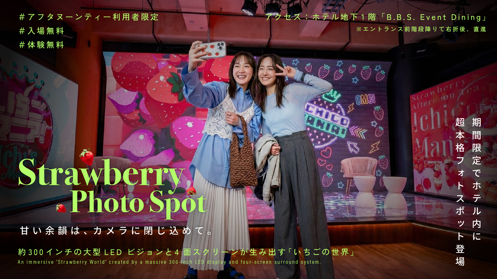 約300インチのメインLEDビジョンを中心に、横幅約12m、床面までシームレスにつながる4面一体型ビジョンを完備。プロモーション映像、広告撮影、ミュージックビデオ、スタジオ収録まで、多様なビジュアルコンテンツ制作に対応します。背景演出を自在に切り替え、短時間で多彩なシーン展開が可能。撮影や収録の合間にはホール内で本格的な料理やドリンクを楽しむなど、リラックスした空間の中でクリエイティブワークを進めることができます。「B.B.S. Event Dining」は、スタジオ機能とダイニング体験をひとつにした、これまでにない次世代型撮影空間です。