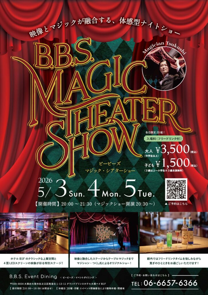 2026年5月3日(日)~5月5日(火・祝)、ゴールデンウィーク期間の3日間夜限定で、グランドプリンスホテル大阪ベイB1F「B.B.S. Event Dining(ビービーズ・イベントダイニング)」にて、初のマジックショーを開催します。