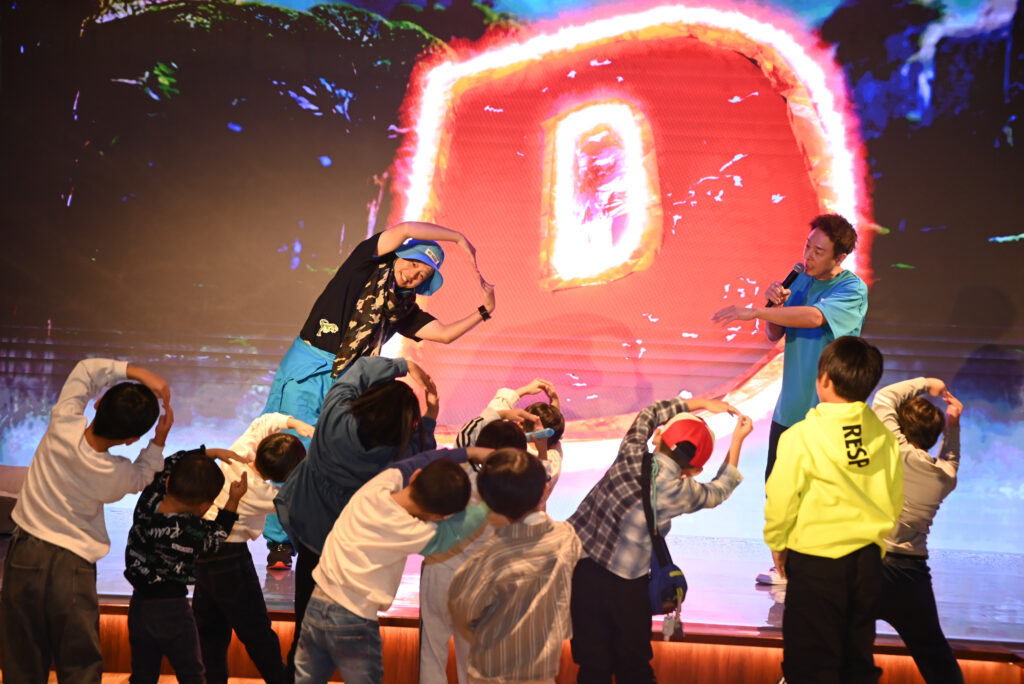 リアルな恐竜の出現に子ども達は大興奮!悪役の巨大コングには大号泣する子もいながら、みんなで力を合わせてオリジナルポーズをとって戦いぬきました。大画面スクリーンはもちろん、ショーのストーリーに合わせたB.B.S.テクニカルチームの映像・音響・照明技術が加わり、大迫力の演出で子どもはもちろん、大人も一緒に、家族みんなで楽しめる体験型アトラクションを展開することができました!