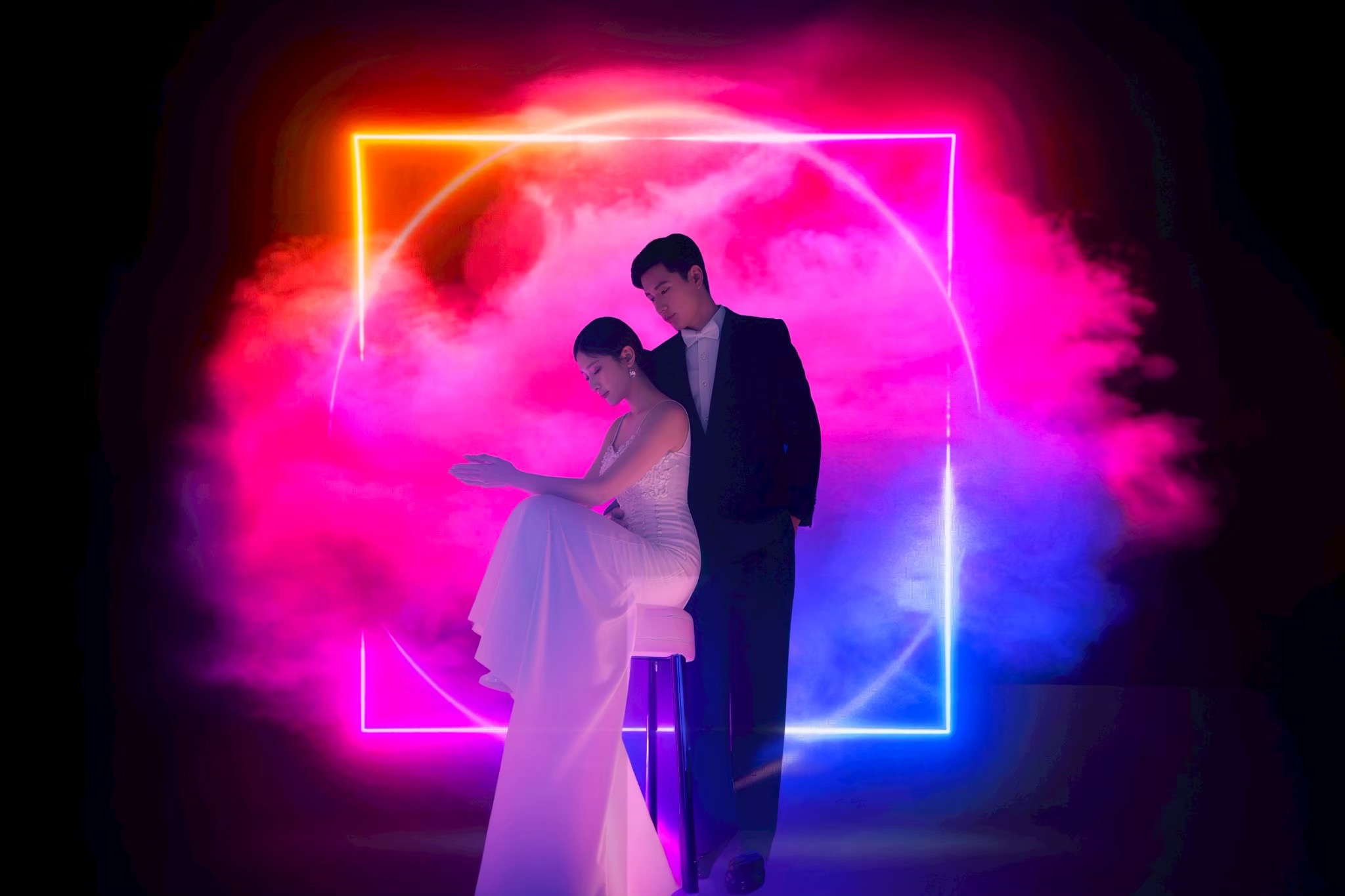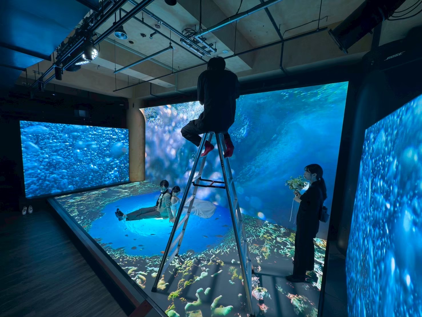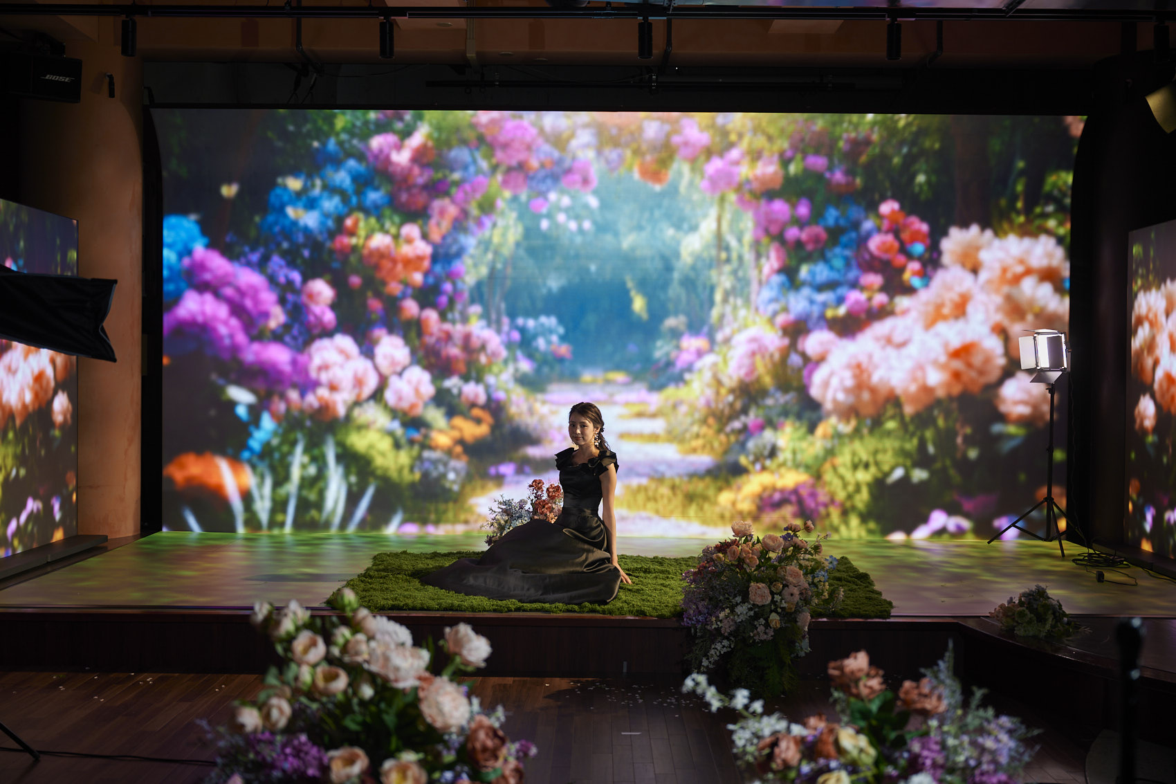 B.B.S.は関西エリアでは希少なLEDビジョン常設のバーチャルプロダクションスタジオ。背景をリアルタイムに映し出すことで“その場にいるような”臨場感を生み出します。撮影現場には専任の映像・音響・照明オペレーターが演出をサポート。さらに装飾チームが入り、演出から空間構成までトータルにサポートします。MVや広告、配信コンテンツ、ブライダル撮影まで、多様な撮影ニーズに応えるスタジオです。